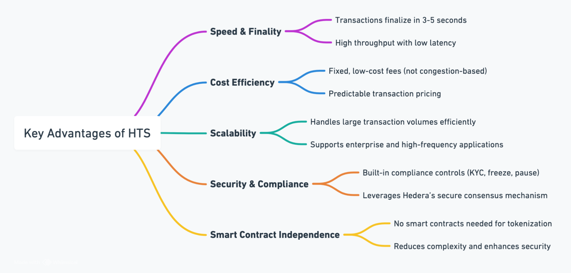 The Hedera Token Service (HTS) provides native support for fungible and non-fungible tokens (NFTs), allowing developers to create and manage tokens without deploying smart contracts. This simplifies tokenization, reduces development complexity, and enhances security. The native tokenization model is optimized for high-speed transactions, supporting up to 10,000 transactions per second (TPS) for token transfers, making it ideal for enterprise-scale applications that require rapid and secure token operations. HTS also provides additional features such as:- Built-in compliance controls – KYC, pause, freeze, and account association