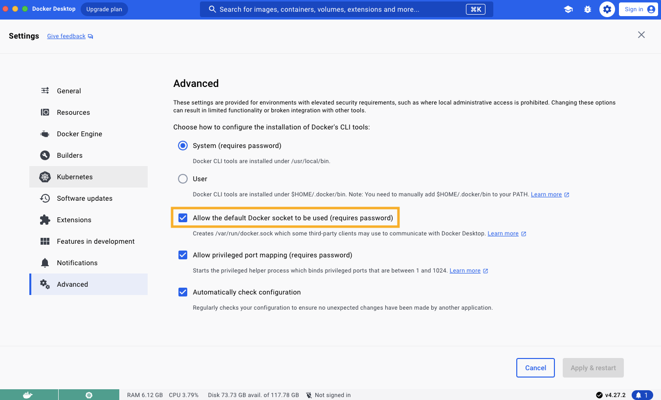 Ensure the following configurations are set at minimum in Docker Settings -> Resources and are available for use:CPUs: 6Memory: 8GBSwap: 1 GBDisk Image Size: 64 GB