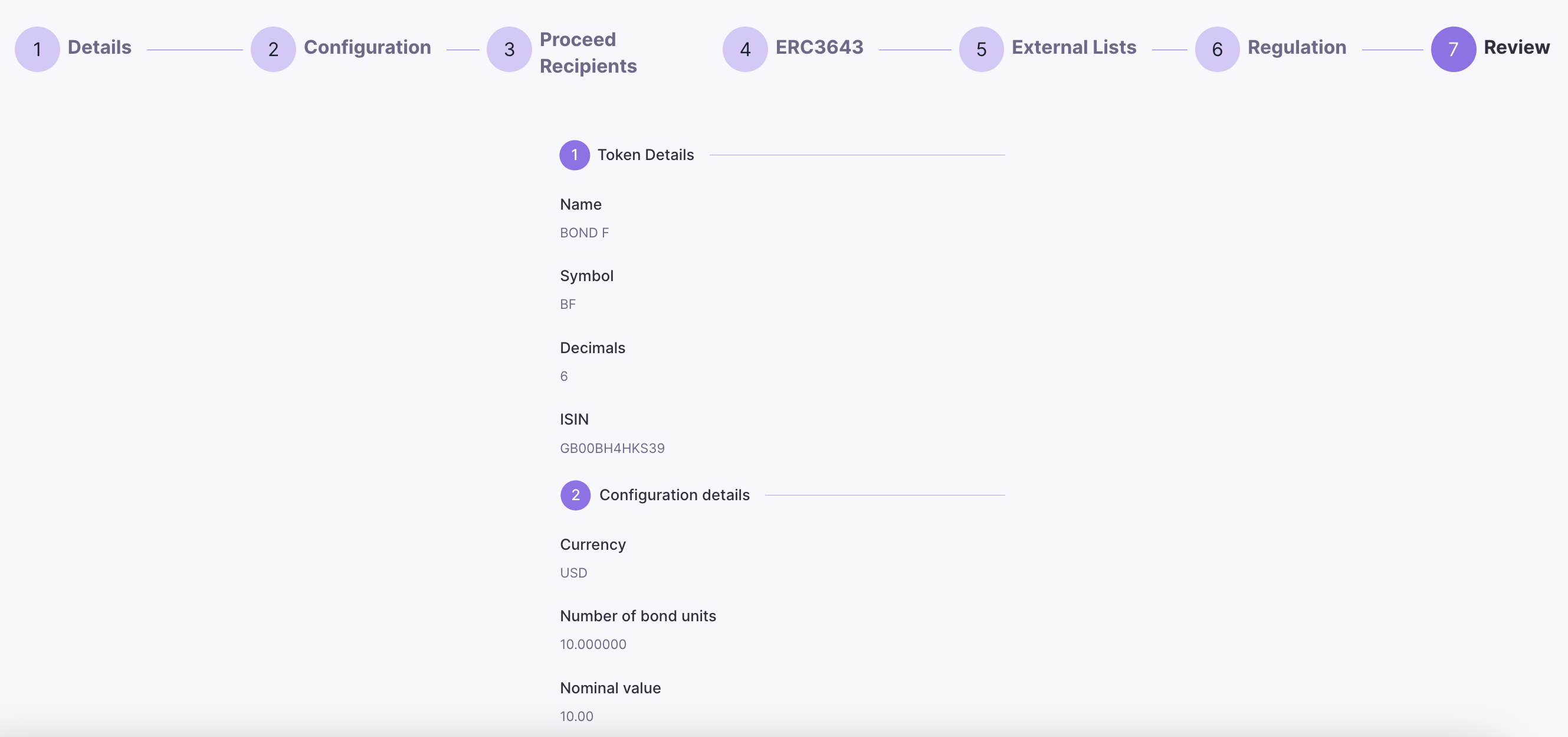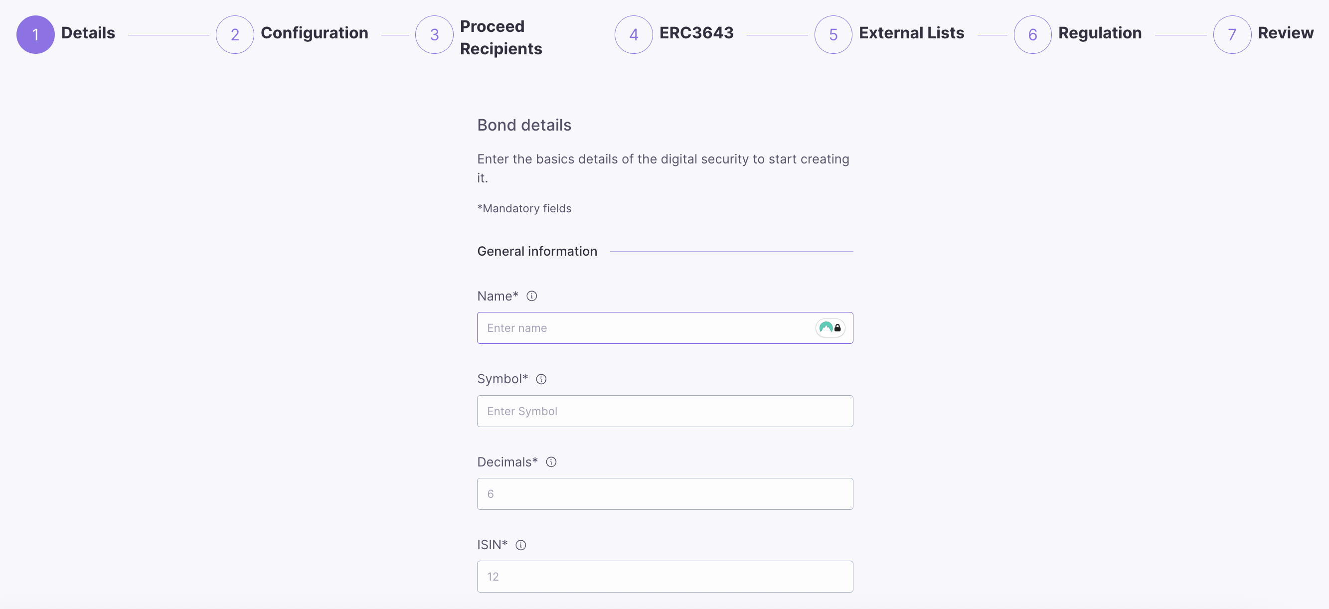 Enter the bond details, such as the nominal value, number of bond units, starting (mint) date, and maturity date.- Number of Bond Units: The total number of bond tokens to be issued. Each unit represents a fraction of the overall bond and can be bought, sold, or transferred.