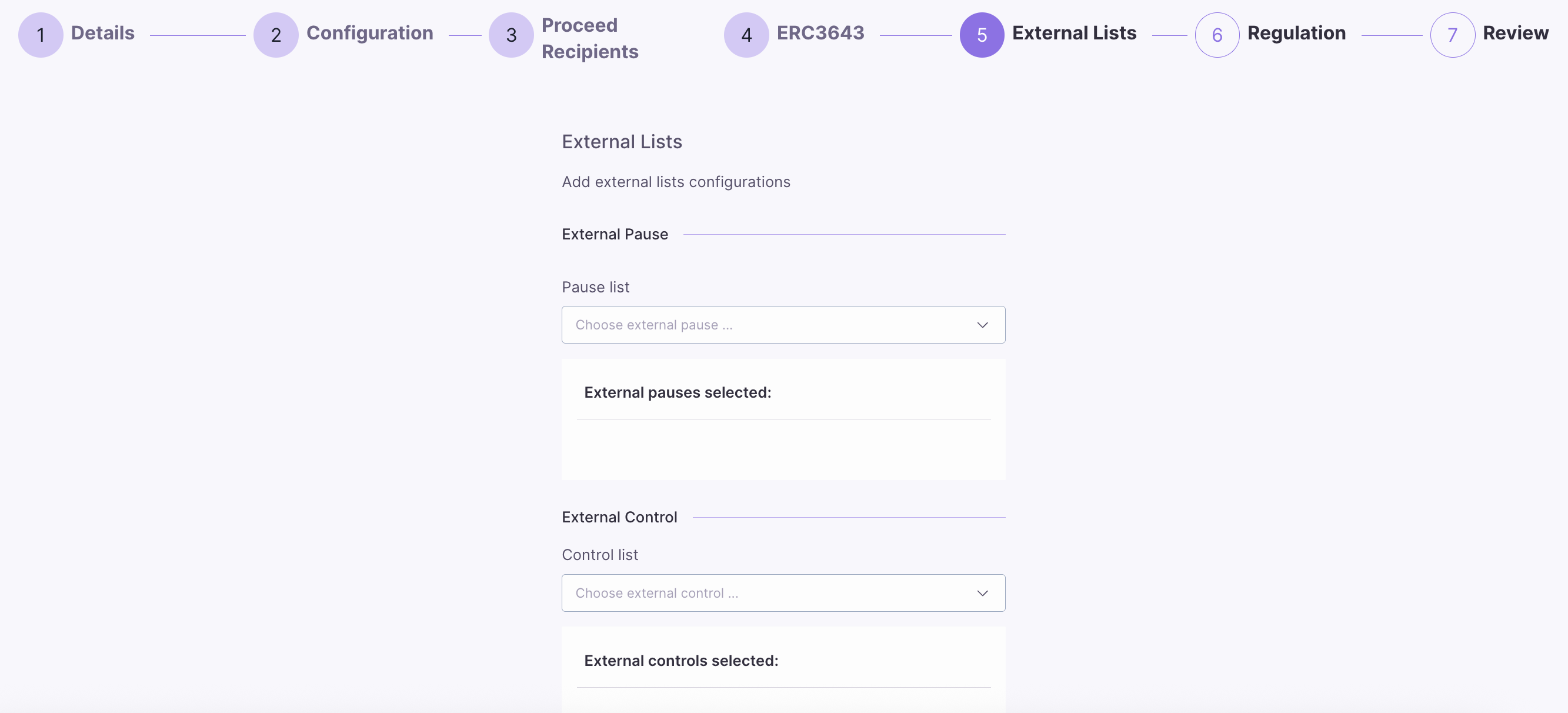 Configure external management lists for enhanced control over your equity. These external lists provide additional layers of security and compliance by integrating with external smart contracts.- External Pause List: Select from available external pause contracts that can trigger emergency pauses of token operations. Multiple pause contracts can be selected to provide redundant safety mechanisms.