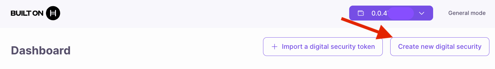 Once your wallet is connected, click “Create new digital security” at the top right of the dashboard.