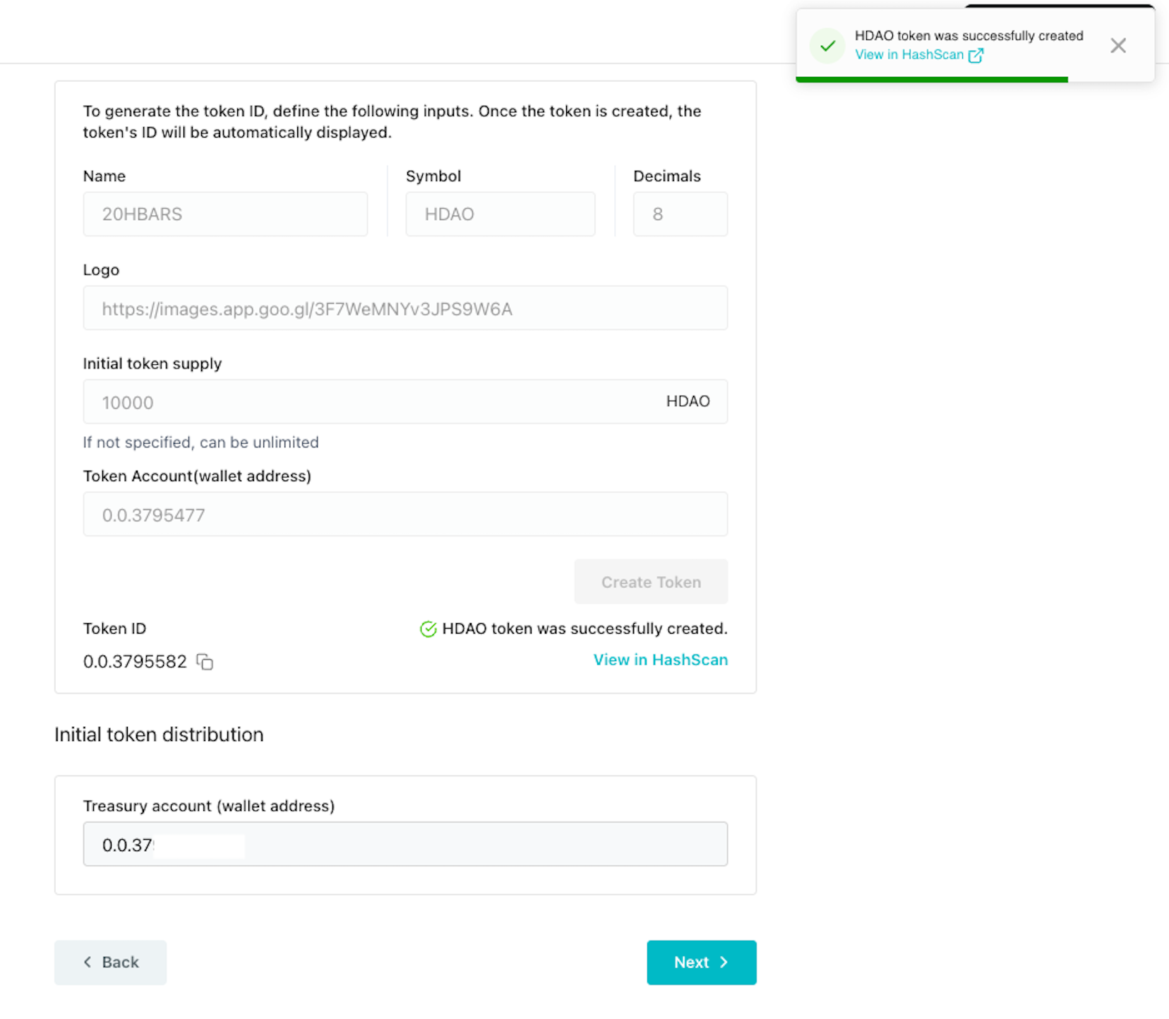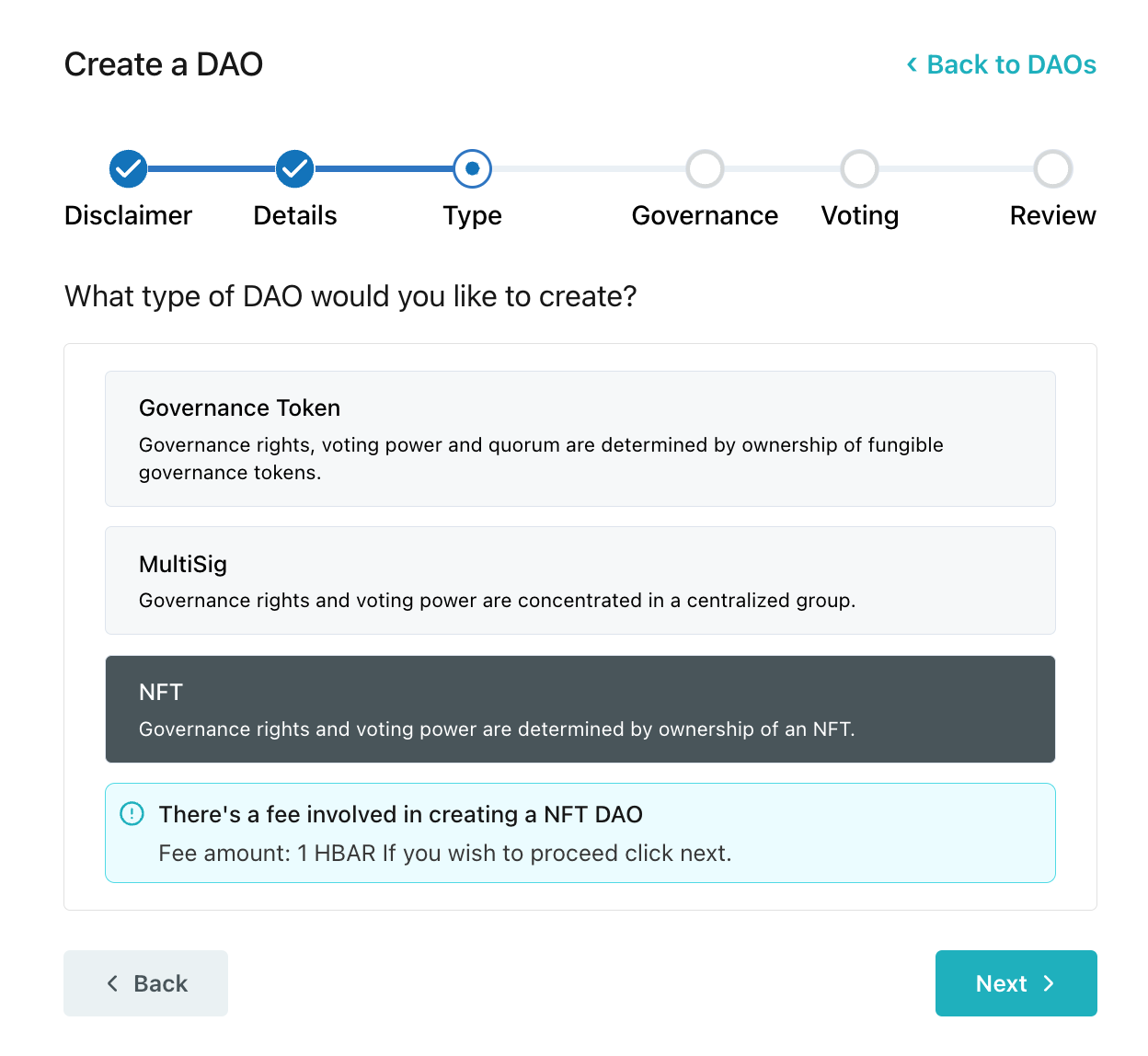After creating and funding a Hedera account, navigate to the HashioDAO web application dashboard and connect your wallet. Once your wallet is connected, click Create a new DAO and this will guide you through a series of setup steps where you will define the details of your DAO including name and governance type.