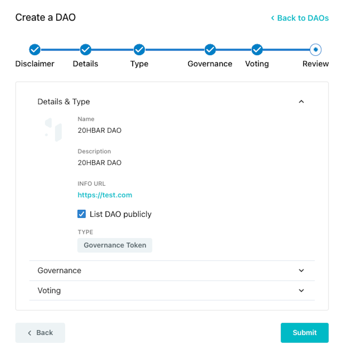 Review the DAO details, governance type, and submit the transaction. Approve the DAO creation transaction in your wallet to proceed.