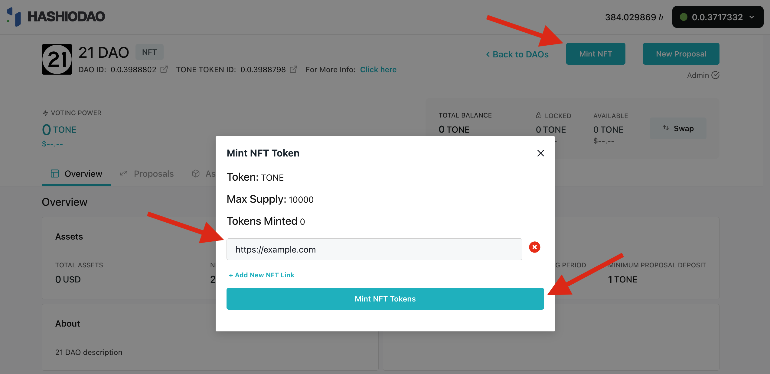 Once your DAO is created, you need to mint the NFT and deposit to the treasury to finish setting up. Click the Mint NFT button, enter the NFT URL, and click the Mint NFT Tokens button.