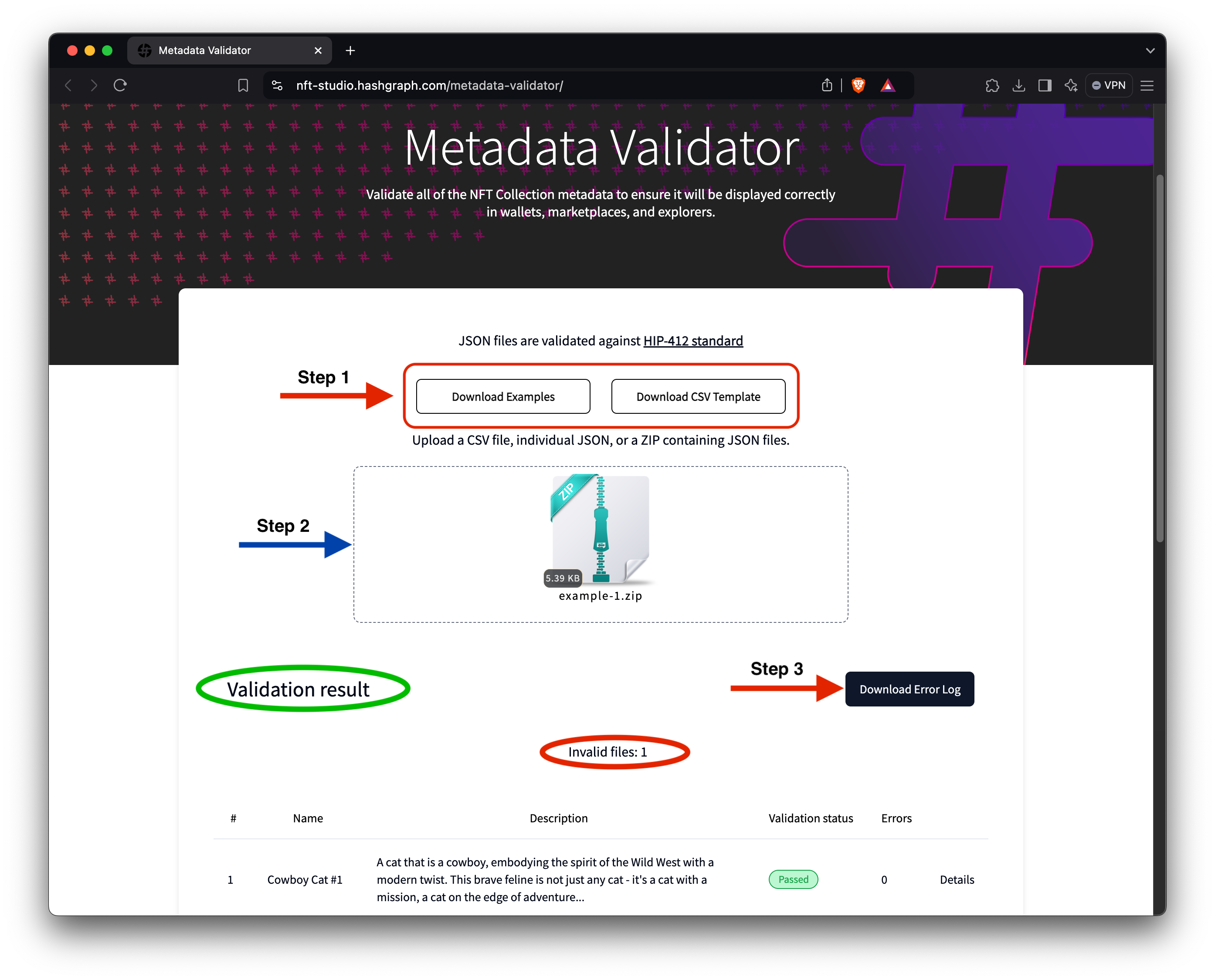 After processing, the tool will return a list of the validation results for each NFT in the file (see the above image in Step 2). It will indicate whether the metadata passes or fails the HIP-412 standards tests.