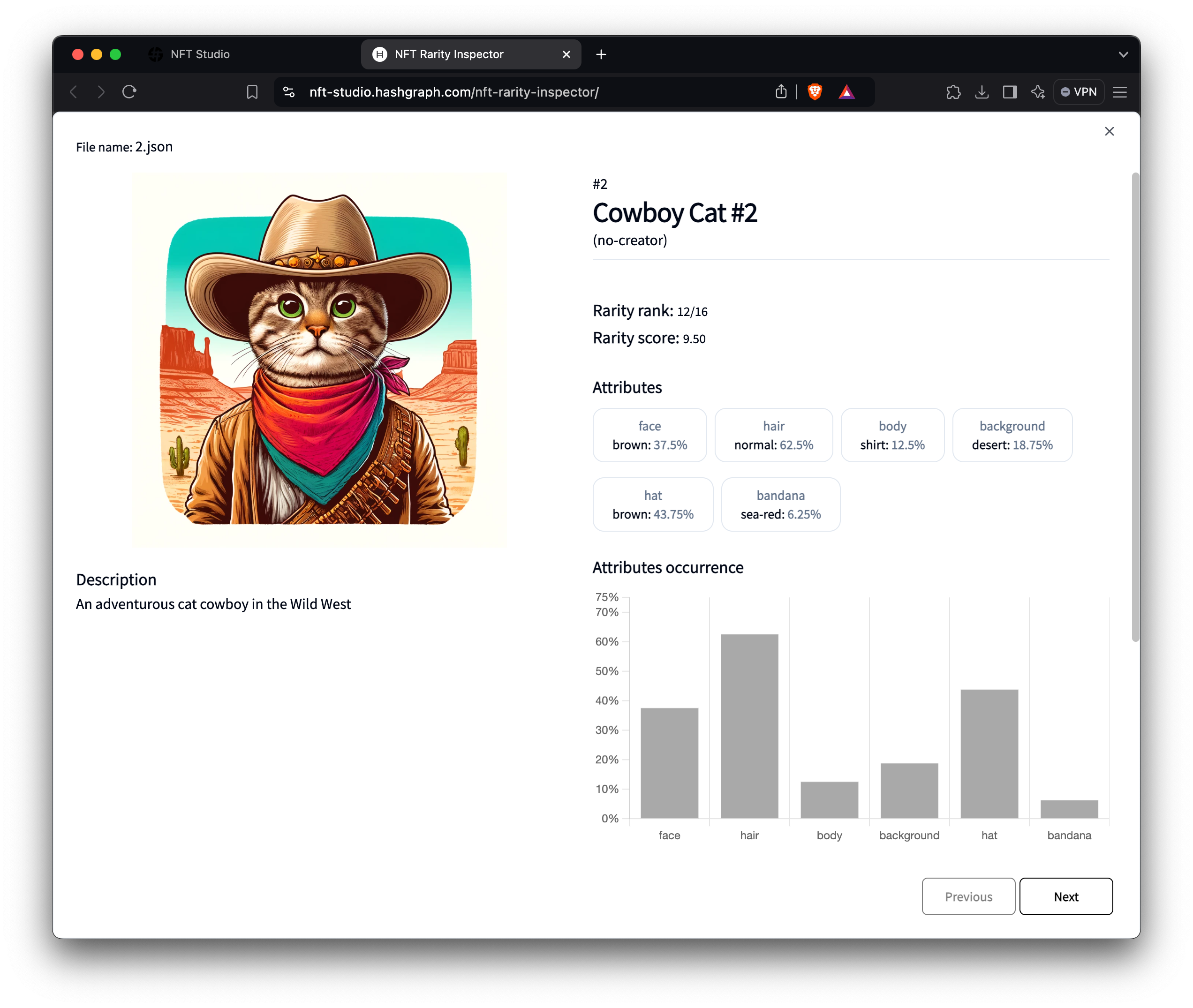 .zip file to verify NFT metadata and check for compliance with HIP-412 standards. It calculates a rarity score by analyzing the NFT’s traits, features, and properties compared to the entire collection. Once the inspection is complete, each NFT is assigned a rarity score based on its uniqueness, helping artists, collectors, and traders understand its value. The higher the score, the rarer and more unique the NFT, making it more valuable than those with lower scores.