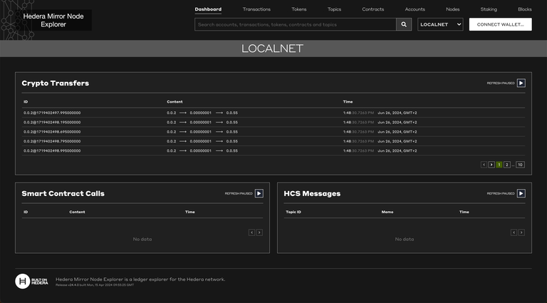 Visit the local mirror node explorer endpoint (http://localhost:8080/devnet/dashboard) in your web browser. Ensure thatLOCALNET is selected, as this will show you the Hedera network running within your local network.