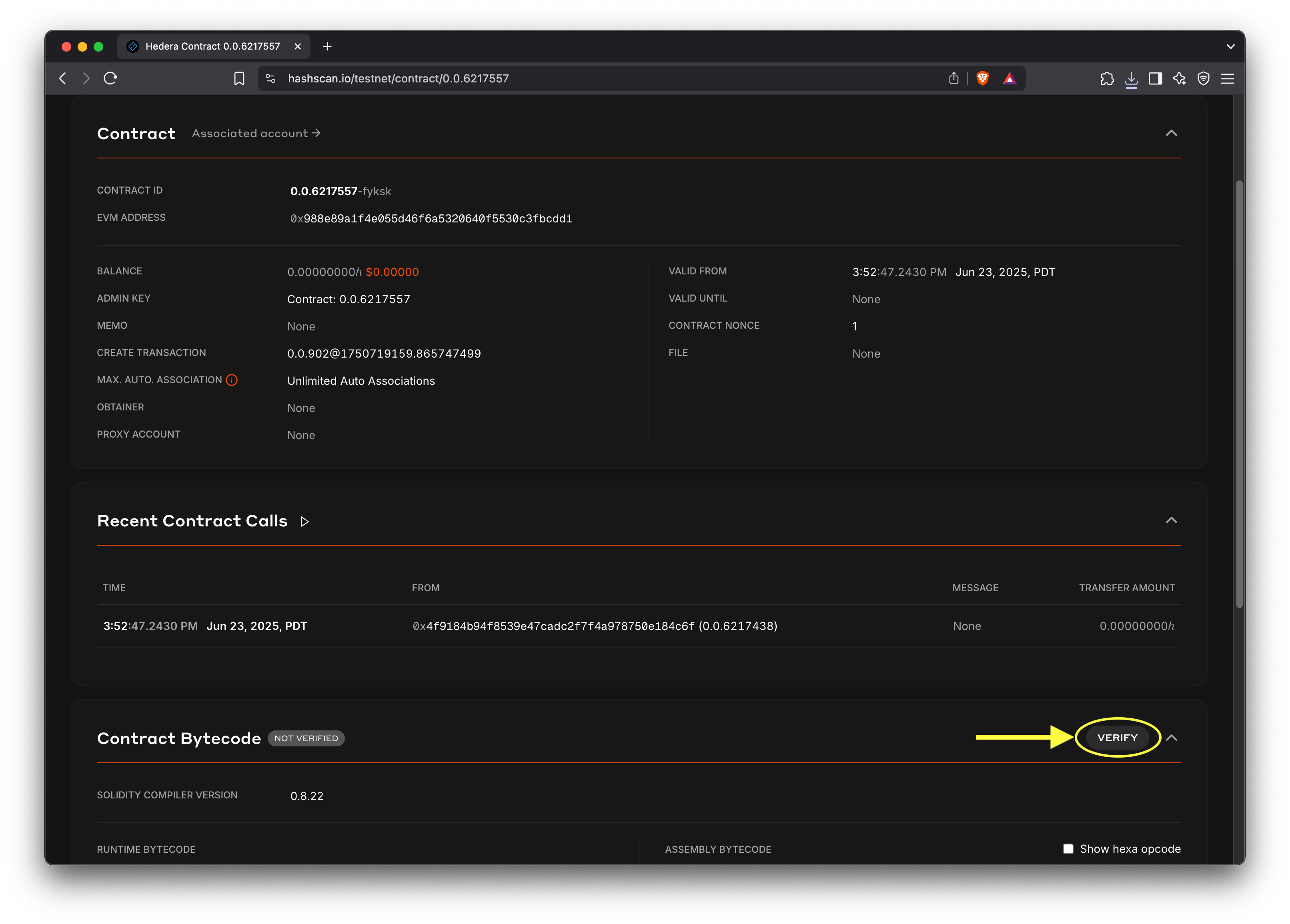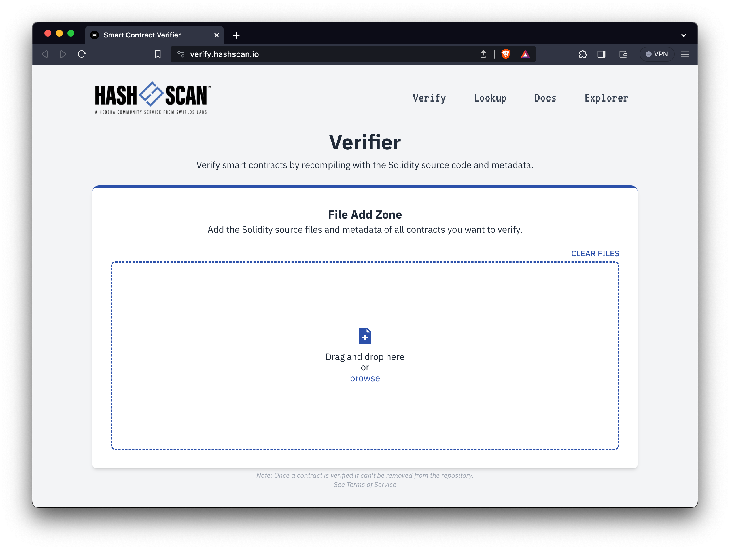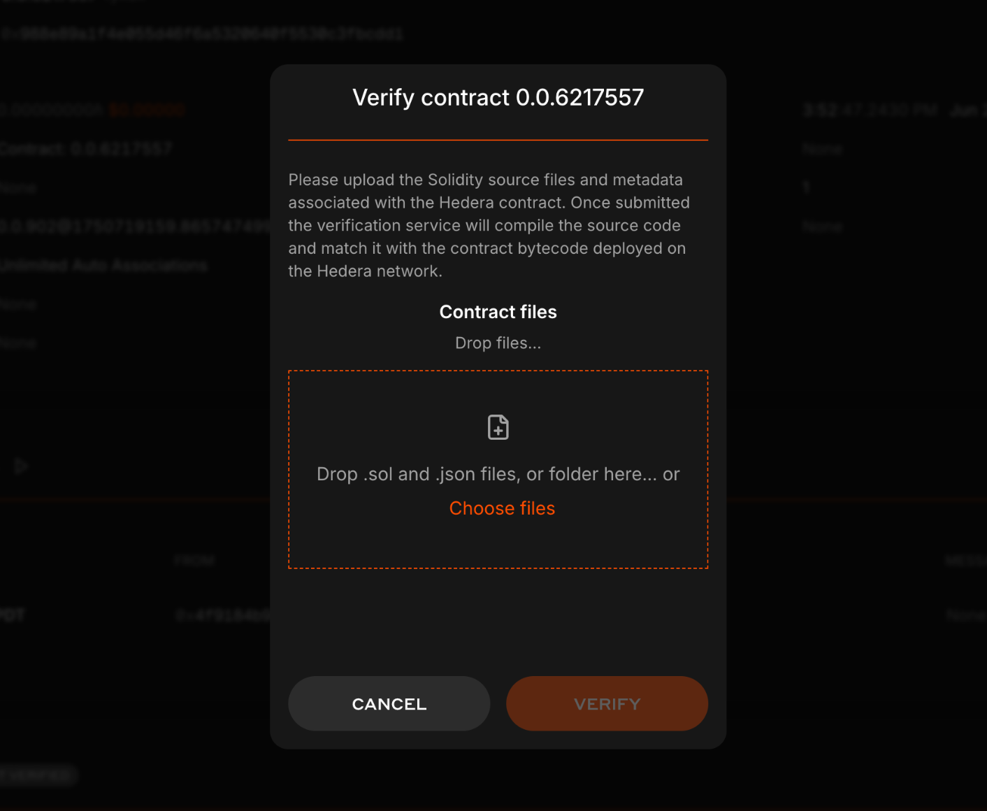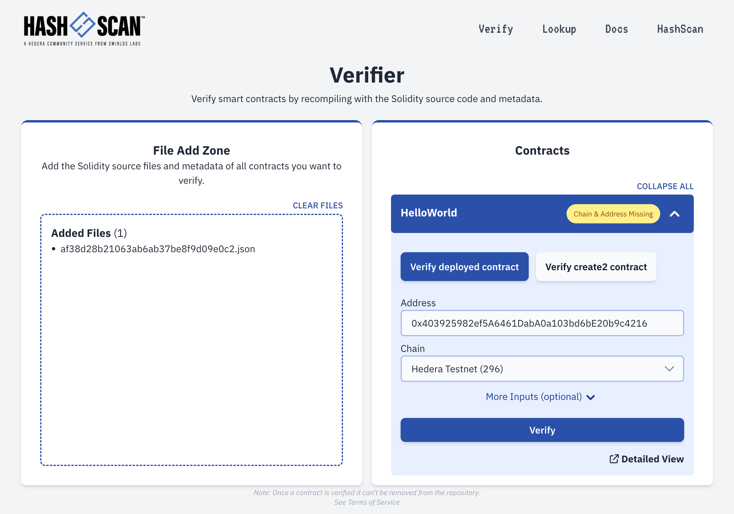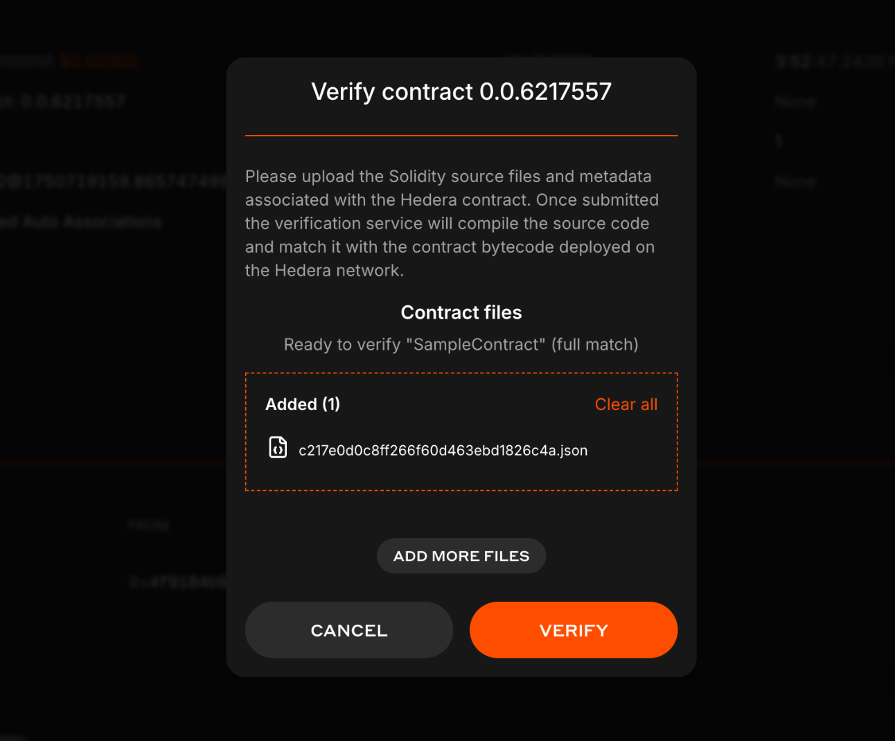 On HashScan, go to the contract’s page, click Verify, and upload the corresponding single